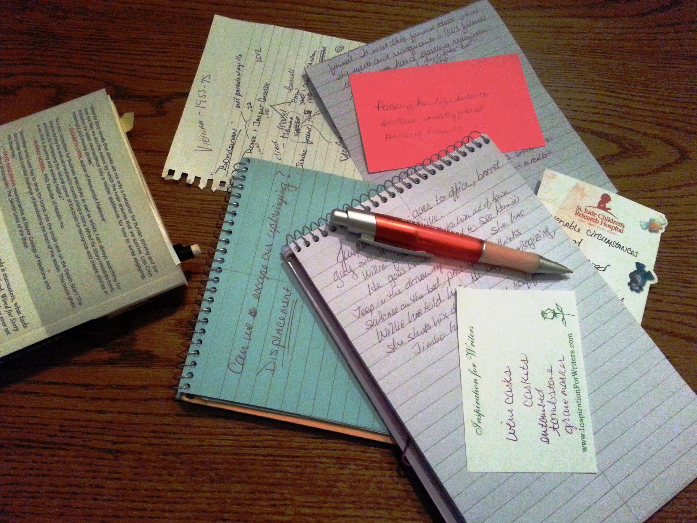 Sometimes I make notes when a great idea pops into my head. My desk, my purse, and the inside covers of books I’m reading are littered with scribbles; scrawled ideas, scenes, sentences, or even sparse phrases that I know I’ll use when I next sit down to write.